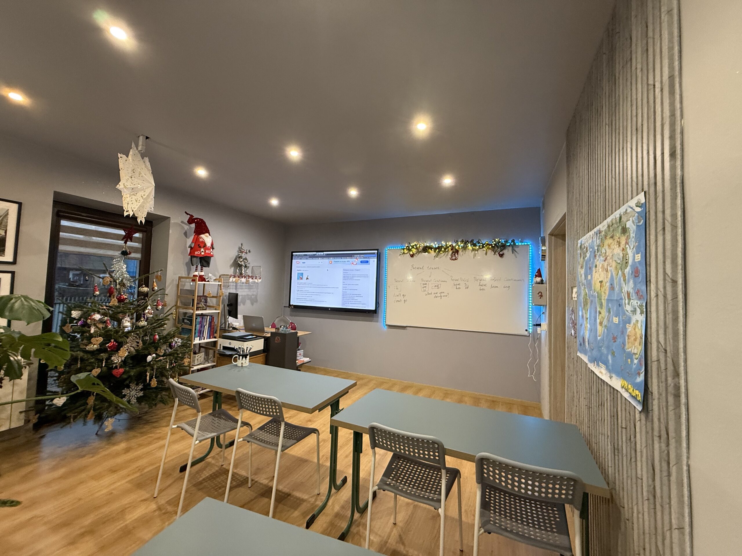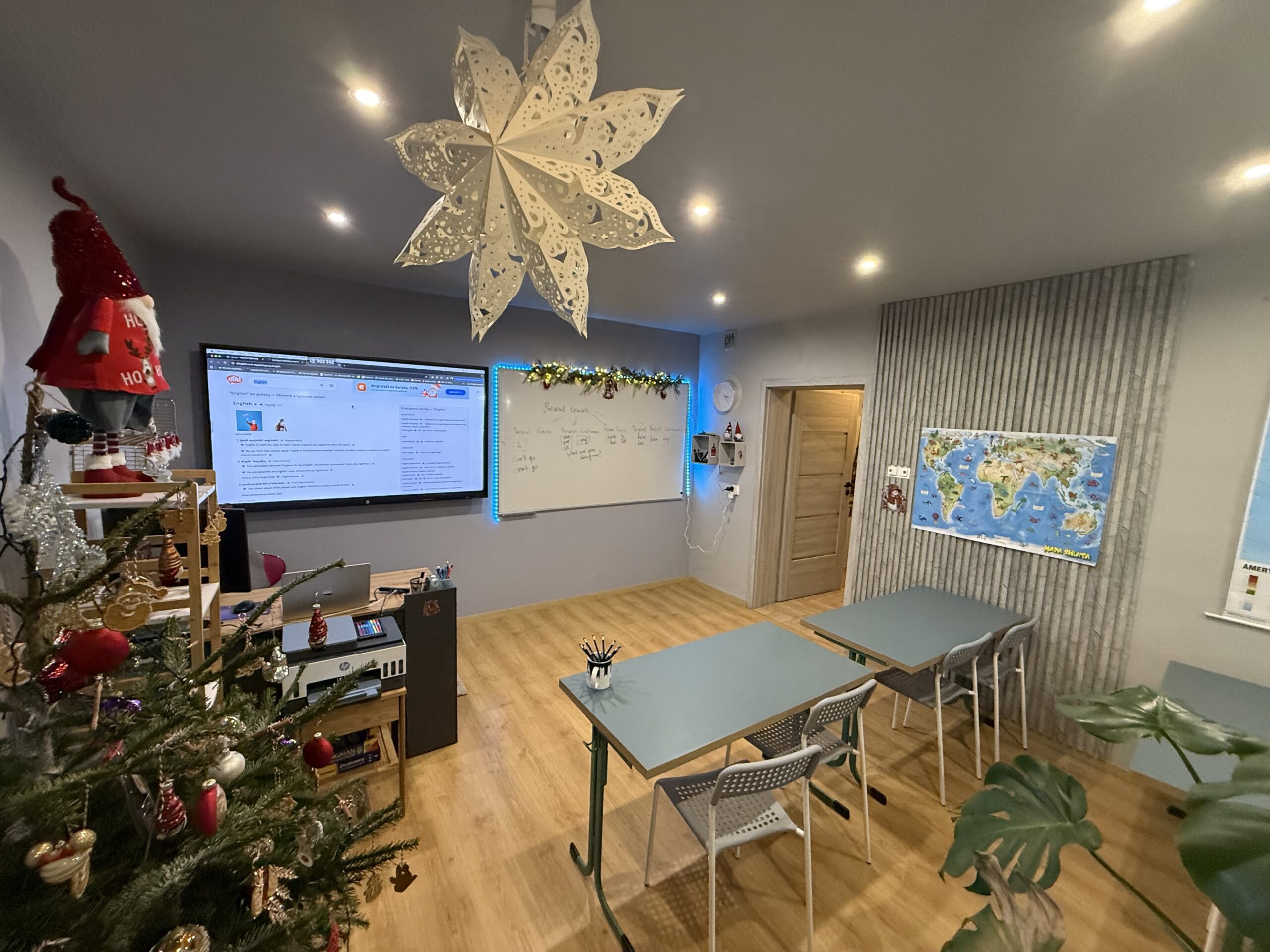 W CYBULSKA ACADEMY stawiamy na nowoczesne, komfortowe warunki nauki oraz realną interakcję. Nasza sala szkoleniowa została zaprojektowana z myślą o skutecznym nauczaniu języka — wyposażona w duże ekrany, multimedia i narzędzia, które wspierają aktywne uczestnictwo w zajęciach.