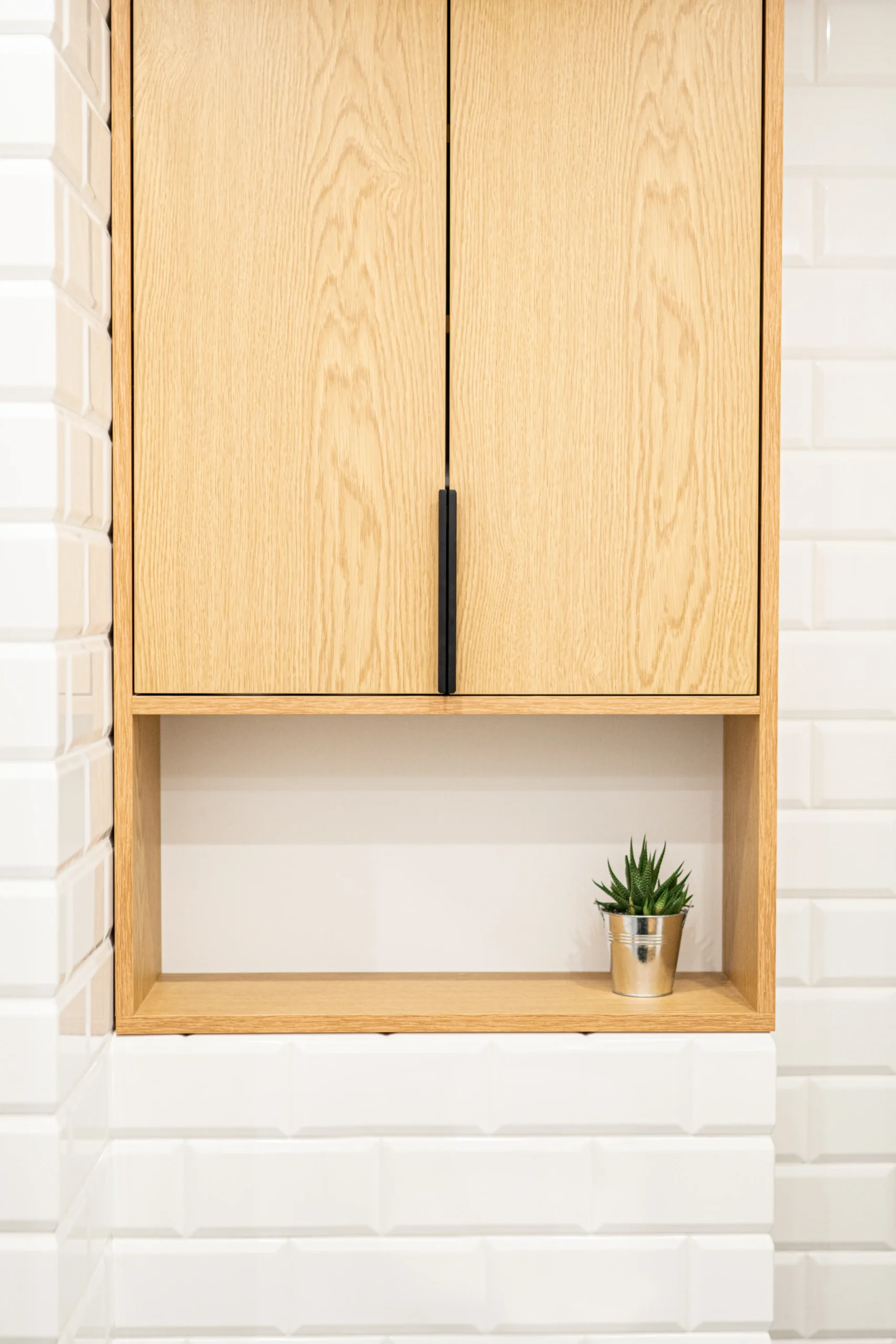 Łazienka wymaga inteligentnego systemu przechowywania, aby drobne akcesoria i kosmetyki nie tworzyły chaosu. Nasza ergonomia wykracza poza standardowe półki. Projektujemy zabudowy pionowe od podłogi do sufitu, zapewniając miejsce na ręczniki i środki czystości w szafkach gospodarczych.